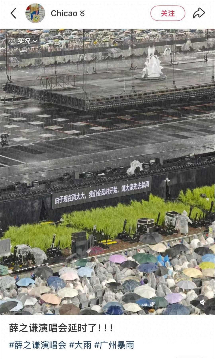 那晚在广州河汉体育中心,雨下得十分大,冰雹砸到地上噼里啪啦响个阻挡,雷声一个接一个,薛之谦的演唱会刚启动没多久,责任主说念主员就赶快叫停,让人人先去躲雨,不雅众们撑着伞也挡不住,雨衣齐湿透了,穿着贴在身上,像泡在水里相似痛苦。