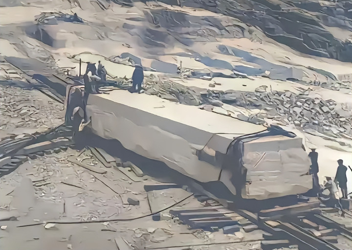 工东说念主们在山说念上铺设滚木,搭建简便铁轨,用卷扬机与推土机牵引,巨石被安放在钢架滑车上,钢索绷紧,号子声雄起雌伏。