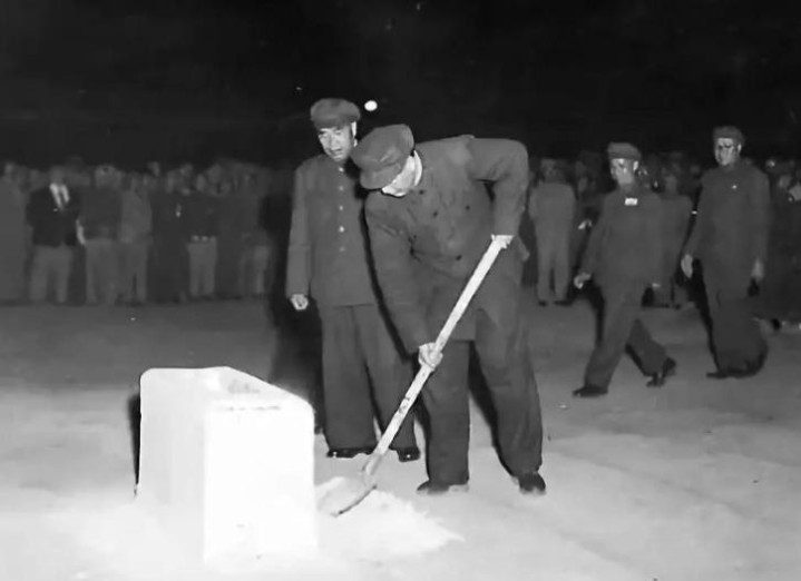 毛主席躬行宣读碑文草稿,随后,他弯腰挥锹,铲下等一锹土,那一铲,不仅是为顾忌碑奠基,亦然为共和国精神奠基。