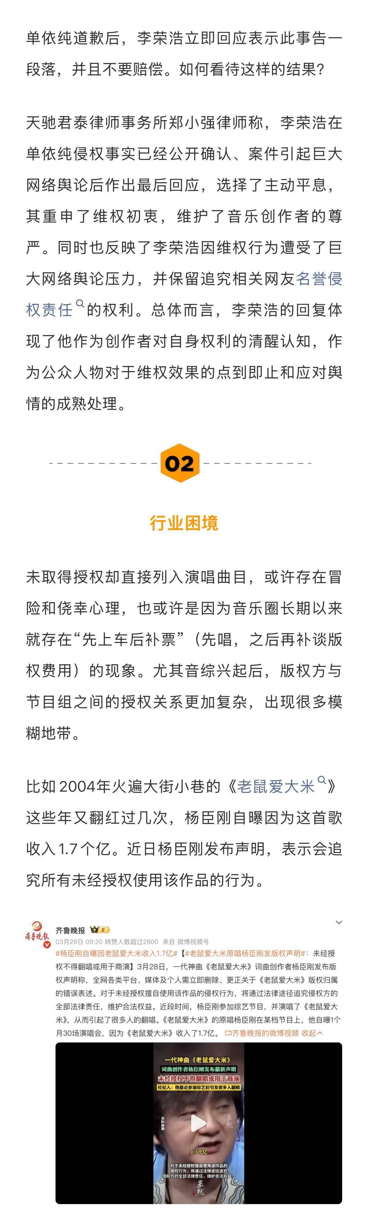 不外话说追忆,这事儿也不全怪歌手和驾驭方。音著协的授权经过照实有点复杂,有技术央求了半个月齐没音信。再加上当年侵权资本太低,赔点钱就能了事,谁还景象而已走经过?但咫尺不同样了,李荣浩这一闹,悉数这个词行业齐开动景仰版权了。神话咫尺上演左券里齐得明确标注每首歌的授权景色,连艺东说念主我方齐要署名说明。