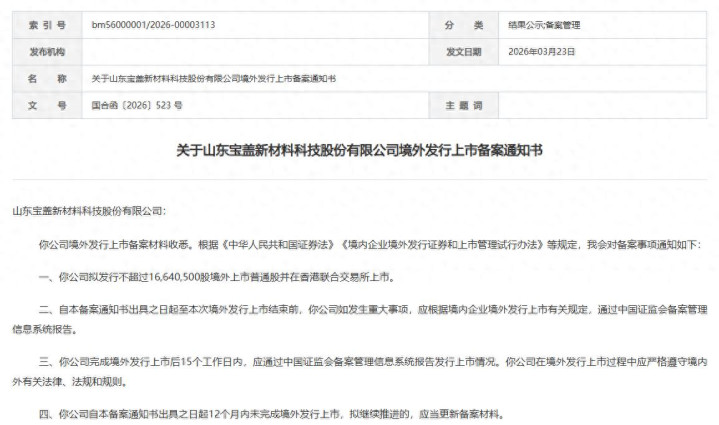 3月23日,中国证监会国外配合司发布《对于山东宝盖新材料科技股份有限公司境外刊行上市备案示知书》。宝盖新材拟刊行不卓越1664.05万股境外上市等闲股并在香港聚拢往复所上市。