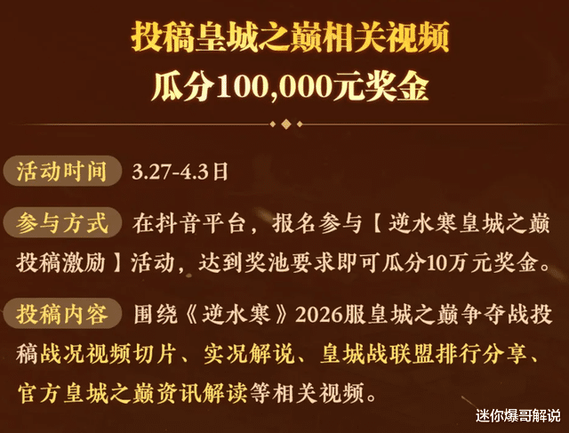 为了让全民参与这场江湖盛事,逆水寒官方开启赛事视频投稿动作,只好发布皇城之巅关连视频骨子,江南体育(JNsports)官网app下载就能参与平分10万现款大奖,号称游戏史上的“天价稿费”。