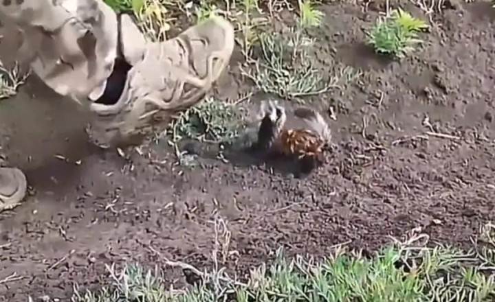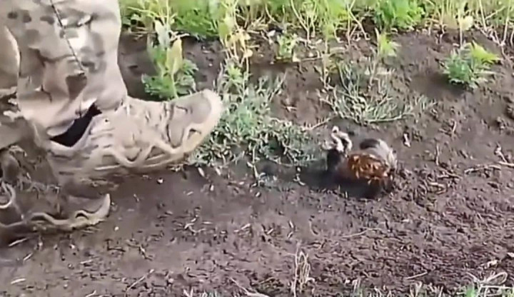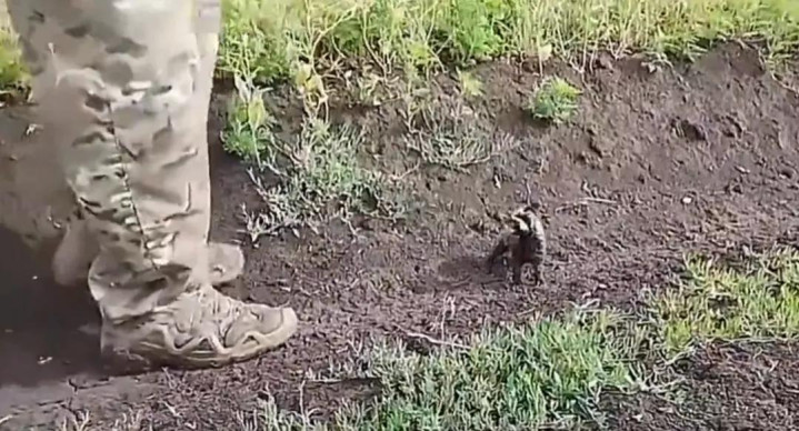 视频里一个穿戴士兵作战服的东谈主站在线路被什么重型征战,可能是军用卡车辞世坦克碾过的草地上,他此时正在跟一只超等迷你的小动物坚持!