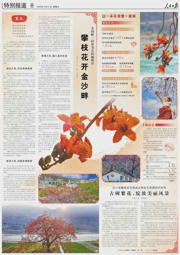 与攀钢开发同步,攀枝花特区于1965年竖立,1987年改名为攀枝花市,成为宇宙独一以花为名的地级市,攀枝花亦被细目为该市市花。