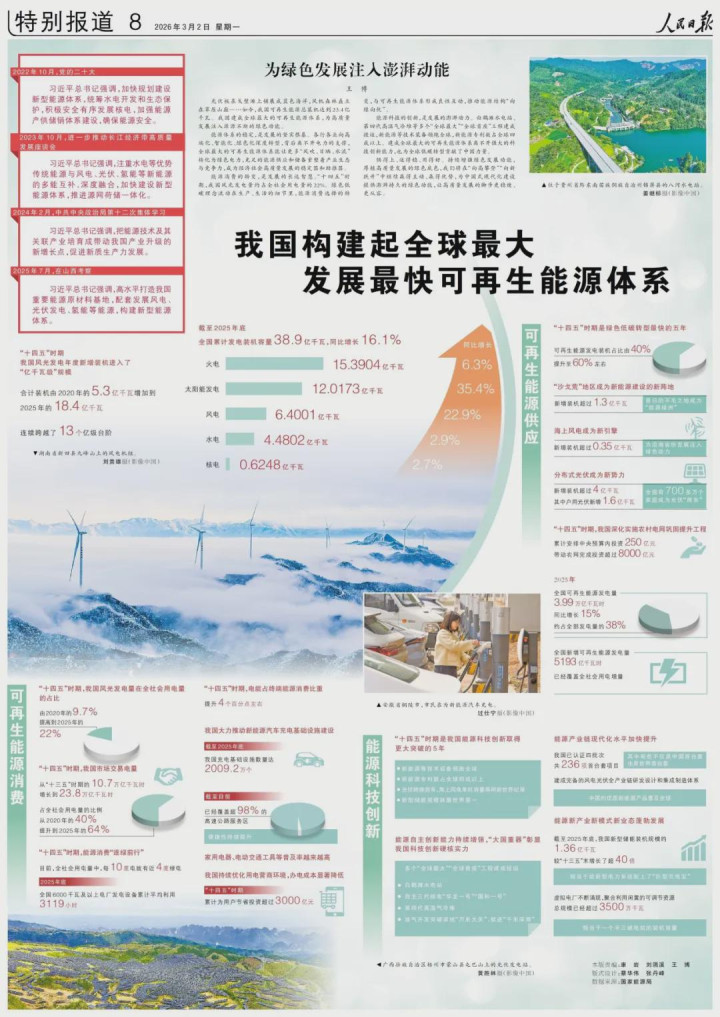 光伏板在戈壁滩上铺展成蓝色海洋,风机丛林矗立在草原山巅……如今,我国可再活泼力总装机达到23.4亿千瓦。我国建成巨匠最大的可再活泼力体系,为高质地发展注入源远流长的绿色动能。