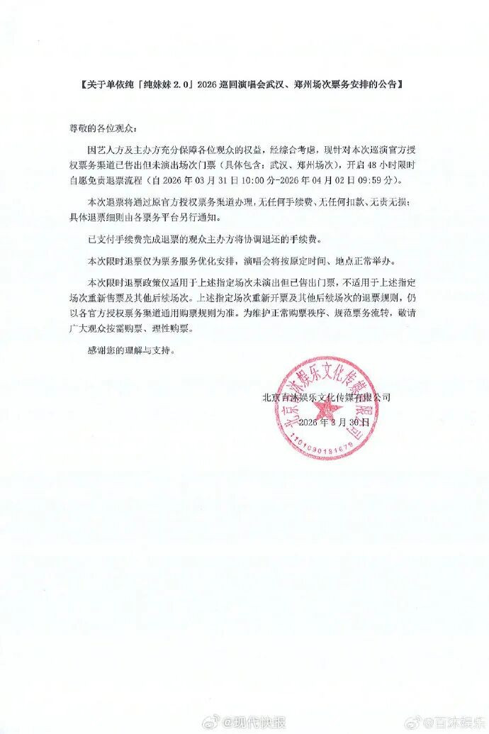 3月30日,单依纯本次巡演的主持方北京百沐文娱文化传媒有限公司@百沐文娱发布公告:经概述洽商,针对@单依纯「纯妹妹2.0」2026巡回演唱会官方授权票务渠说念已售出但未上演场次门票(具体包含:武汉、郑州场次),乐动(中国)app开启48小时限时自发免责退票经由(自2026年03月31日10:00—2026年04月02日09:59)。